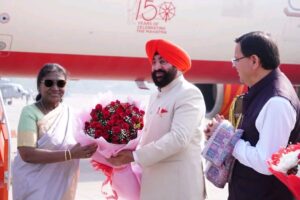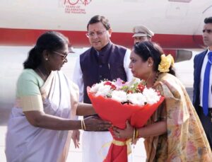 देहरादून : उत्तराखण्ड दौरे पर आयी राष्ट्रपति द्रौपदी मुर्मू के जौलीग्रांट एयरपोर्ट पहुंचने पर राज्यपाल लेफ्टिनेंट जनरल गुरमीत सिंह (से.नि), मुख्यमंत्री पुष्कर सिंह धामी, विधानसभा अध्यक्ष ऋतु खंडूड़ी भूषण, मंत्रीगणों, विधायकगणों और अन्य जनप्रतिनिधियों ने उनका स्वागत एवं अभिनंदन किया।