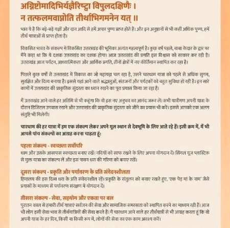अंतिम संकल्प यह लें कि यात्रा के नियमों और यातायात निर्देशों का पालन करें। एक जिम्मेदार और सजग नागरिक के रूप में इस तीर्थ यात्रा को सुरक्षित और सुगम बनाएं। हम ये प्रयास करें कि हमारी यात्रा से, इस यात्रा के आयोजन और प्रबंधन में जितने भी लोग लगे हुए हैं, उन्हें कोई असुविधा ना हो। प्रधानमंत्री ने क्रिएटर्स, इंफ्लूएंसर्स से भी उत्तराखण्ड की स्थानीय कहानियों और यहां की छोटी-छोटी परंपराओं को भी जन-जन तक पहुंचाने की अपील की है।