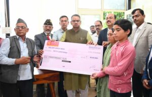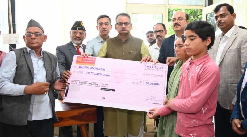 सैनिक कल्याण मंत्री गणेश जोशी ने मृतक उपनलकार्मिक के पिता बलवीर सिंह नेगी को 50 लाख की सहायता का सौंपा चैक