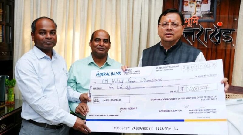 मुख्यमंत्री धामी से सेंट जोसेफ अकादमी के स्कूल प्रबंधन ने की मुलाकात, आपदा पुनर्निर्माण कार्यों के लिए प्रदान की ₹10 लाख धनराशि