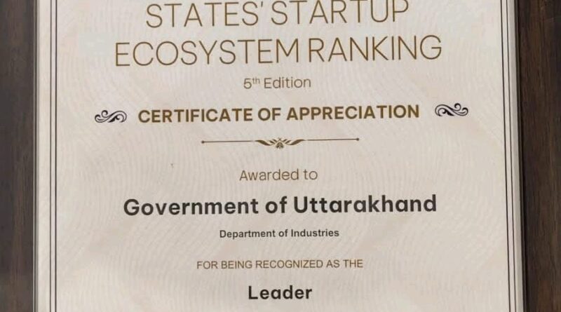 स्टार्टअप इंडिया रैंकिंग में उत्तराखंड को मिला ‘लीडर’ का दर्जा, केंद्र सरकार ने दिया सर्टिफिकेट ऑफ एप्रिसिएशन,मुख्यमंत्री धामी बोले- युवाओं में अद्भुत क्षमता